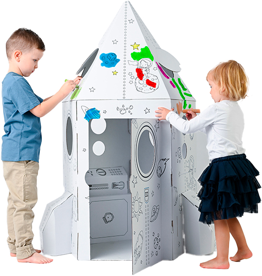 Den sammenklappelige farveraket er lavet af hvidt. 3-lags bølgepap. Pakkens indhold. 1 x farvelægnings- og legeraket. Fortrykte motiver Nem og hurtig samling uden brug af lim eller også saks Har ingen skarpe kanter Pap huset er stabilt og let. Og kan efter afs