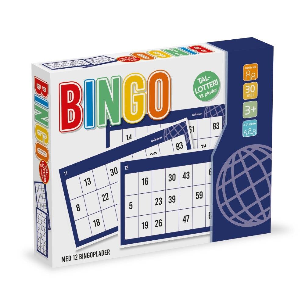 Klassisk og populært BingoTallotteri. Indeholder. 12 plader 90 numre i pap 1 – 90 Inkl. 180 papbrikker til, at dække tallene med. Fra 3 år