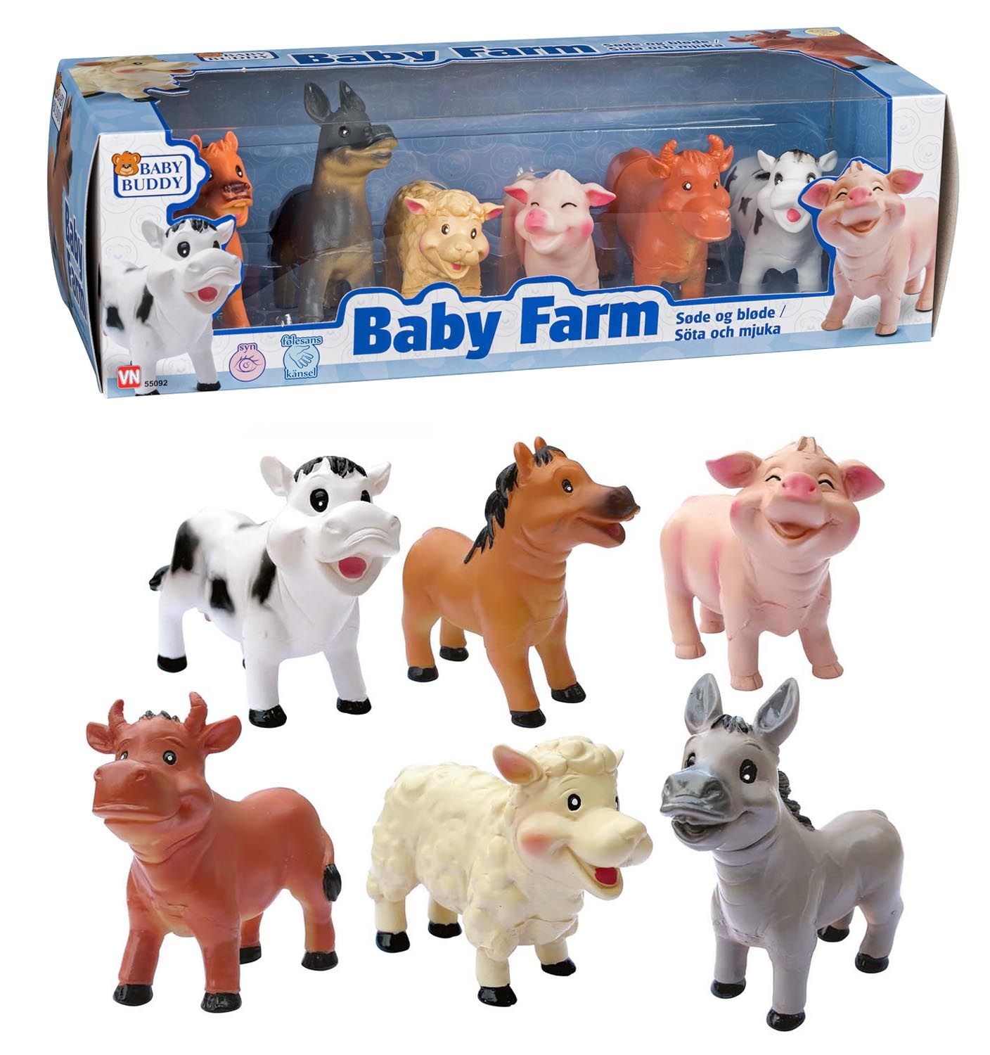 Bondegårdsdyr Denne pakke indeholder seks forskellige søde og bløde bondegårdsdyr. Der er skabt til, at tilfredsstille børns nysgerrighed og give dem mulighed for, at udforske dyrenes former og teksturer. Her er nogle nøglefunktioner ved produktet. Bløde