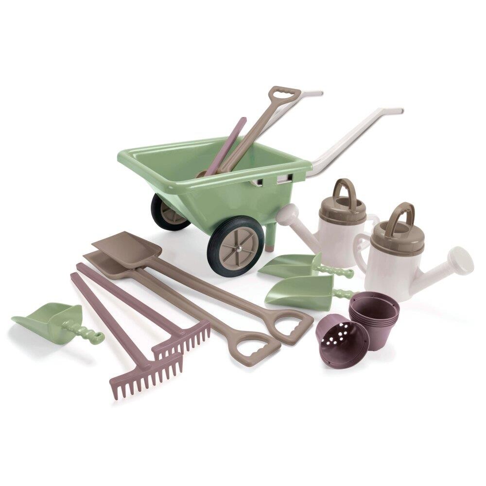 Stort havesandsæt med 18 dele i svanemærket plast. Sættet indeholder trillebør. Vandkander. Skovle. Spader. River og urtepotter. Legetøjet giver flere læringsmuligheder. Som hurtigt vil fange de nysgerrig børns interesse. De fine dæmpede farver og de m