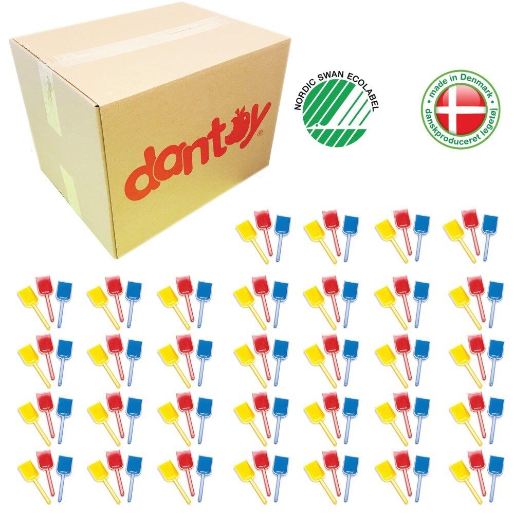 Sandskovl i plast 18 cm – 1 kasse med 96 stk. Skovlen er dansk produceret og Svanemærket. Leveres med 96 stk i en brun kasse -i tre assorterede farver rød. Blå og gul. En lille., Men robust sandskovl. Som passer perfekt til børnehave børnenes små hænder