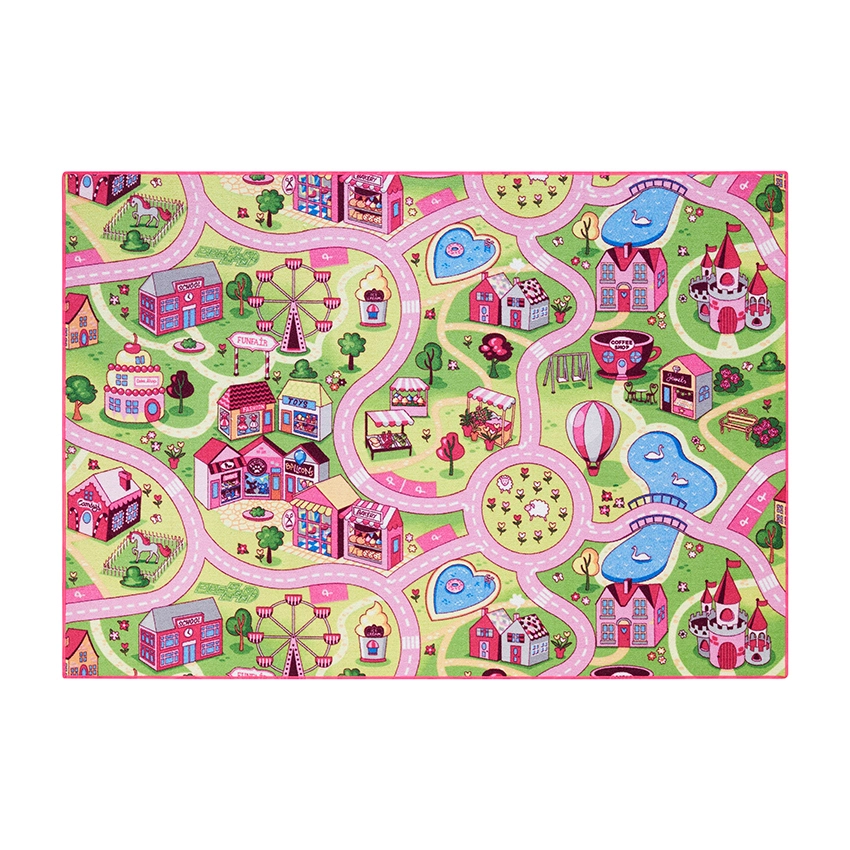 Eventyrligt Pink Legetæppe Tivoli til Børneværelset er en fantastisk tilføjelse til ethvert børneværelse. Dette tæppe fra Rebel Roads måler 140 ×200 cm og præsenterer et farverigt design med rutsjebaner. Balloner og forlystelser