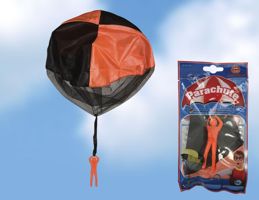 Fold faldskærmen sammen og kast den op i luften. Faldskærmen vil åbne sig med faldskærmsudspringeren og stille og roligt falde til jorden.