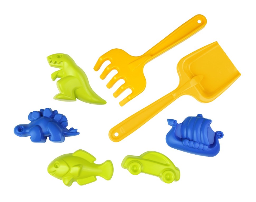 LENA Sandsæt med skovl og rive. 7 dele. 7 dele. Sæt med 5 små sandforme. T-Rex. Stegosaurus. Fisk. Bil og vikingeskib. Med skovl og rive. Ideel til små børnehænder. Til børn fra 12 måneder. Pakket i et net. Hangtag med produktinformation. FREMSTILLET I E