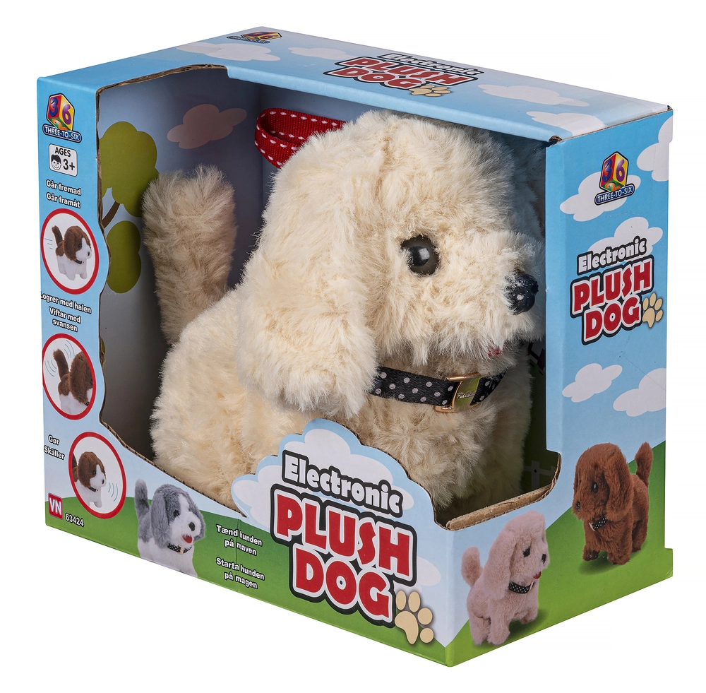 Gå-Gø-hund Går fremad. Logrer med halen og gør. Med halsbånd og snor. Vælg mellem forskellige. Ekskl. 2 stk. AA-batterier.