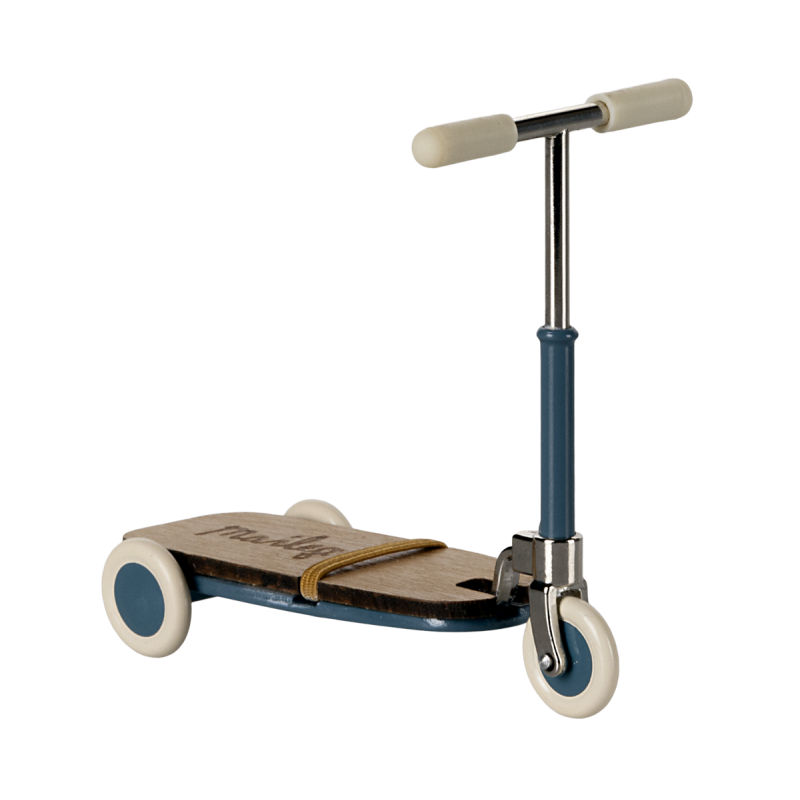 Mål.H. 7.5 B. 8 cm. Materiale. Metal og træMaileg har designet et flot blåtløbehjul specielt til de fine små Maileg mus. Løbehjulet. Der er fremstillet i metal og træ med en lille elastik. Sikrer, at musens fødder bliver stående under turen. Styret