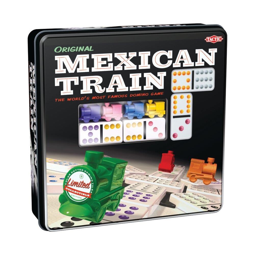 Mexican Train – Et Dominospil. Hver spiller danner kæder af dominobrikker. Man må også lægge brikker til sine medspillers kæder. Målet er, at blive den første der lægger alle sine brikker og holder toget kørende hele vejen frem til sejr. For 2-8 spillere