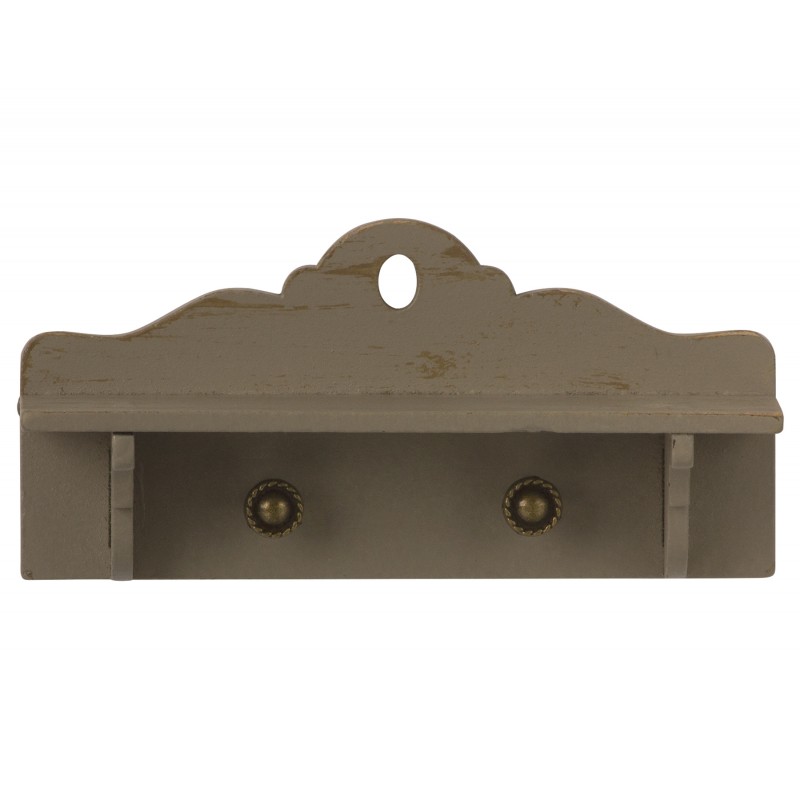 Mål. H. 4. B. 9 cm. Materiale. TræMaileg har designet dennefine træhylde i en super lækker vintage stil. Hylden har en flotgråbrun farve med 2 små knager.I en fin messingfarve., Så du kan hænge musens tøj op. Hylden passer perfekt til Mailegs d