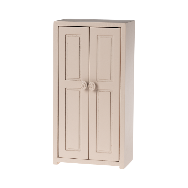 Mål. H.14 B.7 D. 4 cm. Materiale. TræSødt lillelegetøjsskab til børneværelset. Lyserødt miniature skab fra Maileg. Dette fine træskab er malet i en dejliglyserød farve. Har 2 lågersamt tre gyldne bøjler indeni til organisering af dit barns tø