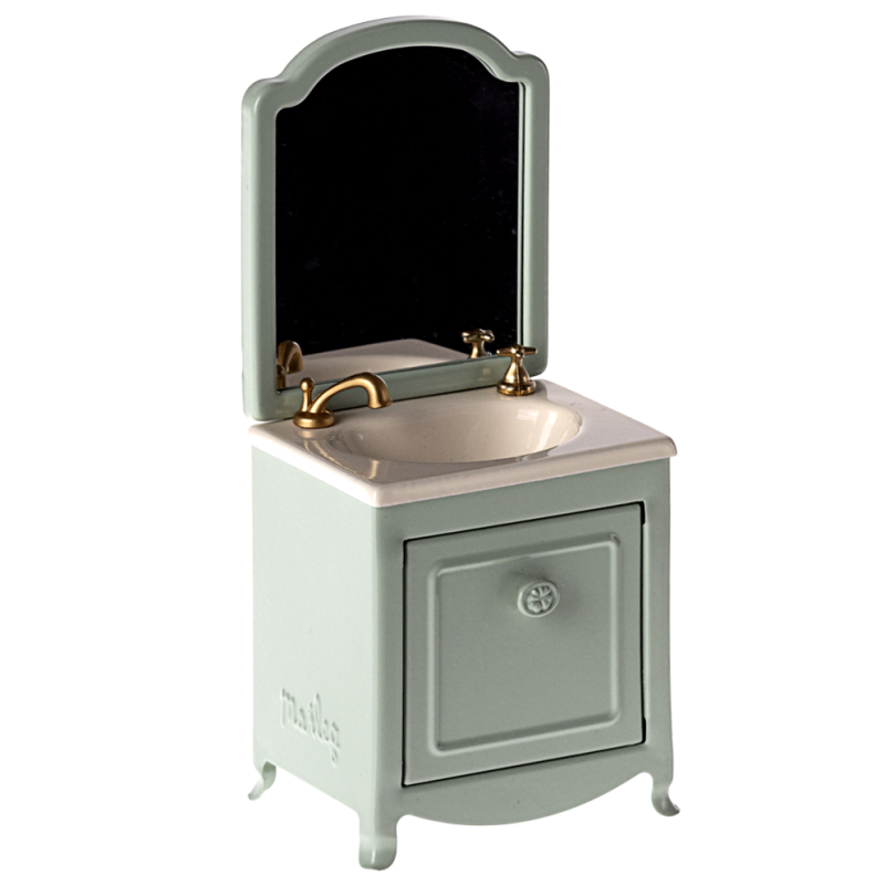 Mål. H. 15. B. 7. D. 5 cm. Materiale. MetalMaileg har designet den mest vidunderligevask med spejl til badeværelset i en super flot mintgrøn i vintage stil. Vasken er lavet af hvidt metal med 2 fine gylden vandhaner. Vasken er sat ovenpå et matchende
