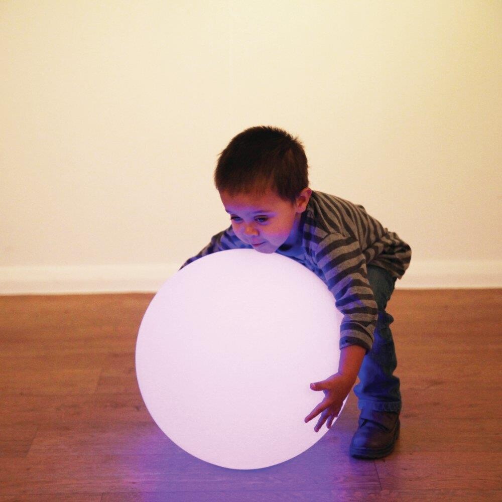 Ultra stærk oplyst hul plastkugle. Som kan opstilles et eller også flere steder i lokalet. For, at skabe en dæmpet og hyggelig baggrunds belysning. Kuglen kan lyse i 16 forskellige farver. Som kan vælges på den medfølgende fjernbetjening. Kuglen kan også indst