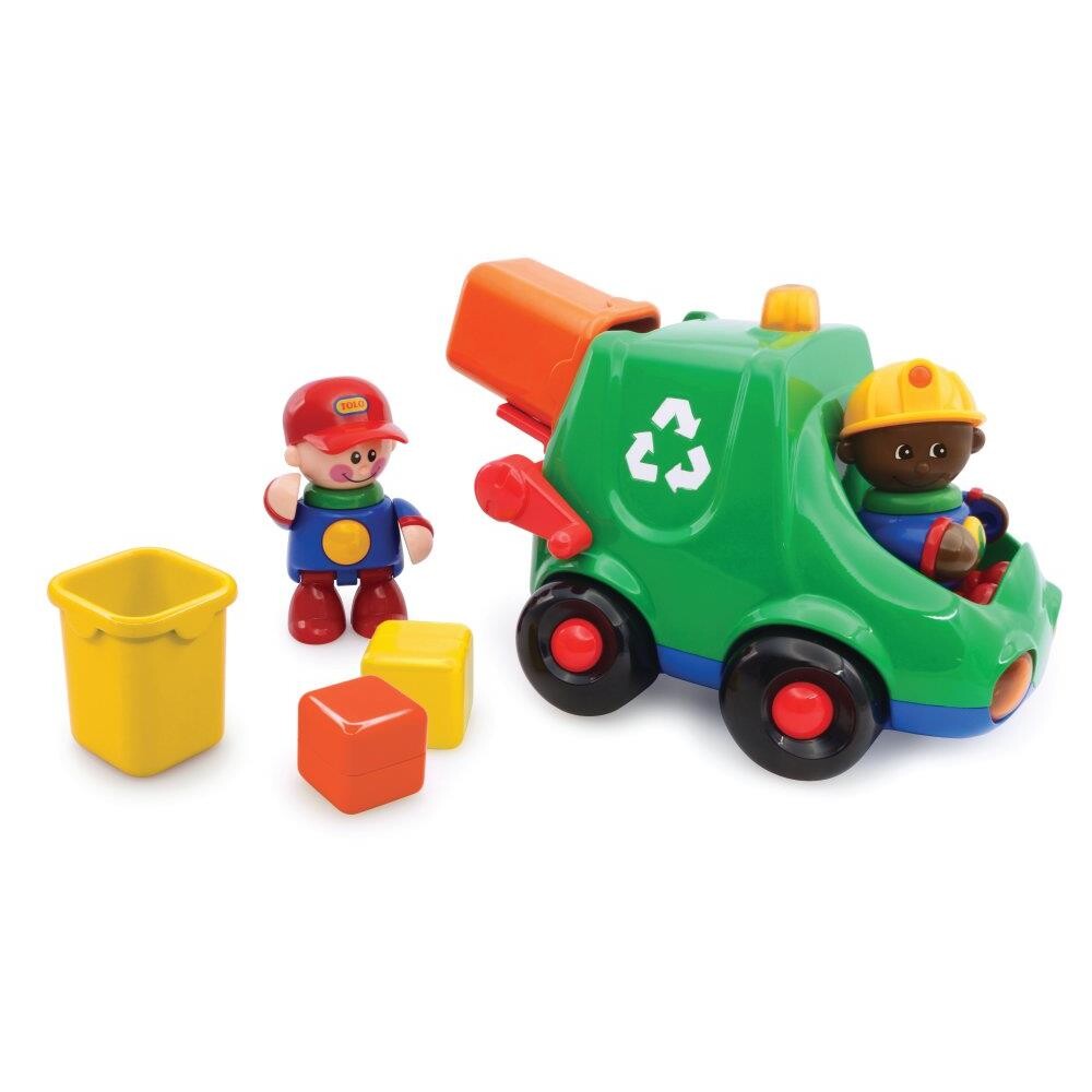 Flot miljøbil i serien TOLO First Friends indeholder 5 dele – Lavet af robust ABS plast. Der er en miljø bil og 2 figurer med 2 skraldespande. Bilen er cirka 20 cm lang og 16 cm bred og høj. Figurerne kan bevæge arme og ben og kan sige lyde. Når de trykke