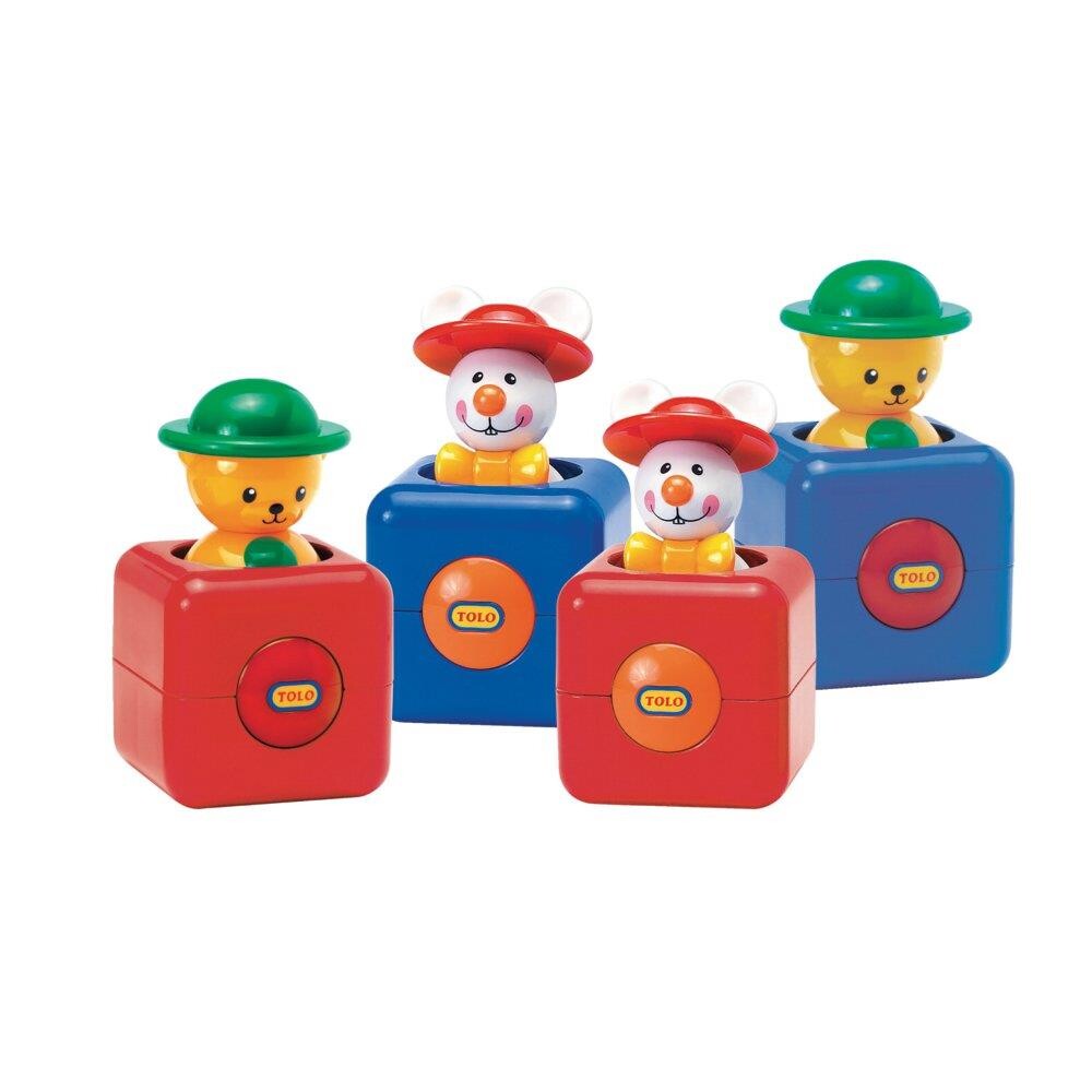 Pop-up legetøj. Sjove figurer i forskellige former og farver. 4 elementer. Fremstillet af robust ABS plast Måler. H.11 x B.6 x L.6 cm når de er poppet-up Fra 6 mdr.
