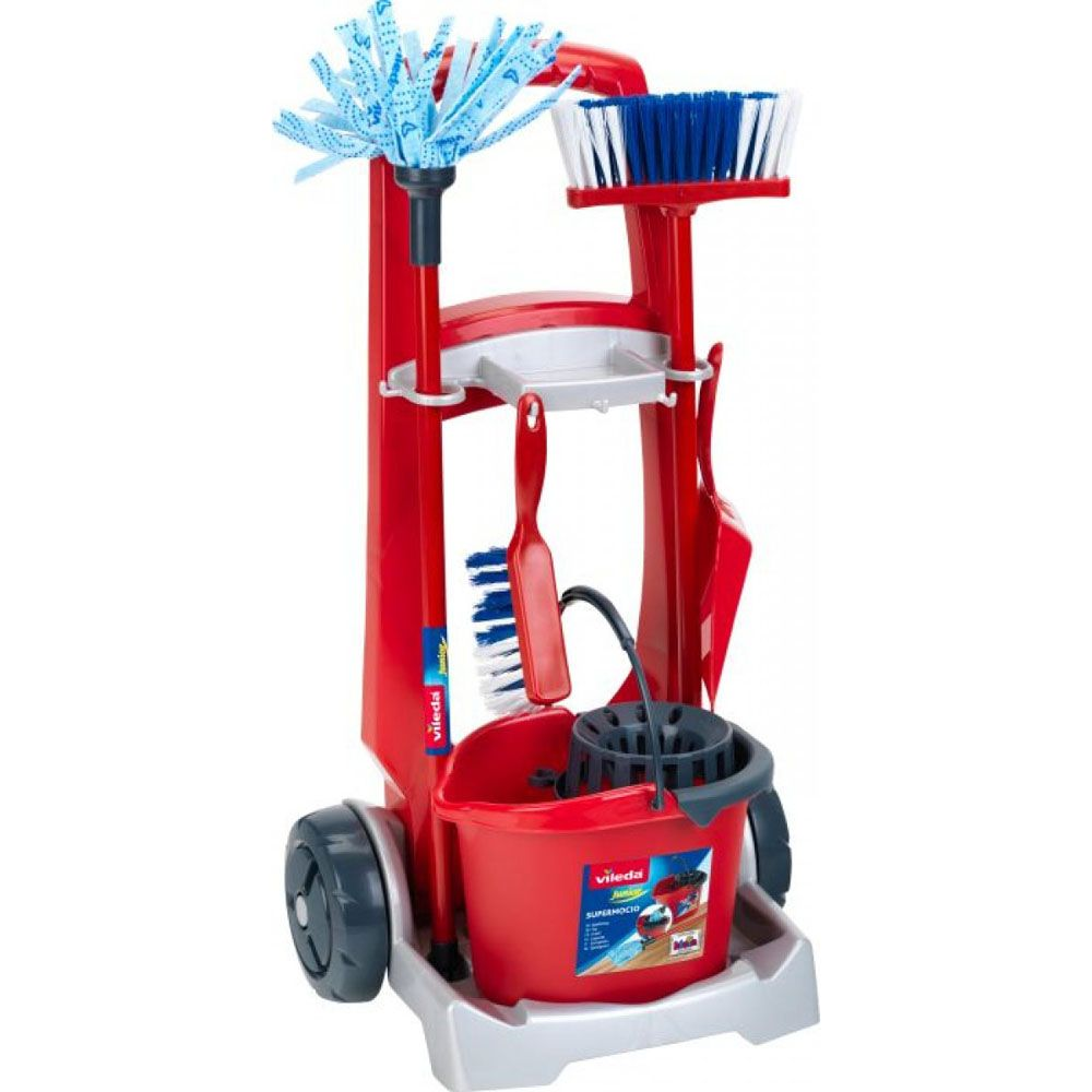Vileda rengøringstrolley er et sjovt og lærende legetøj til børn fra 3 år. Trolleyen er designet i det velkendte Vileda-mærke og kommer med flere tilbehør. Herunder en moppe. En spand. En kost. En håndkost og en fejebakke. Den er perfekt til børn. Der